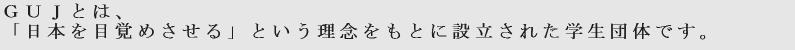 GUJとは、「GET UP JAPAN」と略称です。 「日本を目覚めさせる」という理念のもとに集った学生7名で設立されました。 PROFILE 2012/9/22 7名の東大・慶応・早稲田の学生 針生加奈(早稲田大学3年) イベント主催、会合等。
